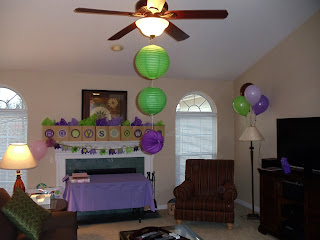 In the bags on the mantel was a game - each bag was filled with an item off my registry starting with that letter (i.e."B" bag had a blanket in it) Each guest had to guess what was in the bag. Then I opened them one by one. It was so cute and made for great decorations too!